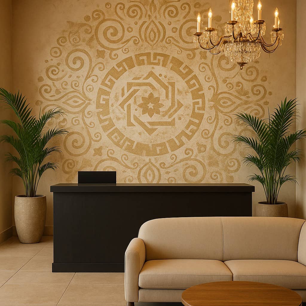 Glastone Magic Paint (GMP) is concentrated. Dilute with water and apply on wall. Use spray, Tyrolean, Design Roller. With stencil, GMP creates beautiful designs on the wall. Fast-drying. Sparkles on the wall.